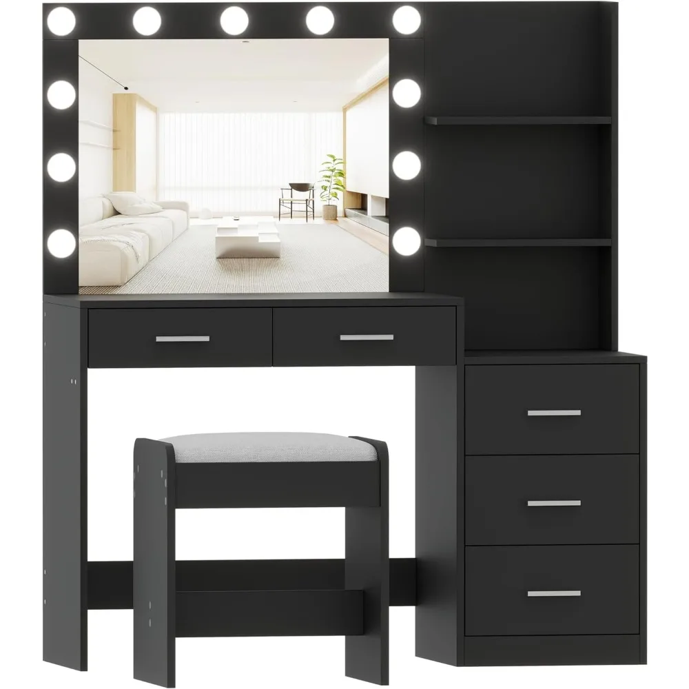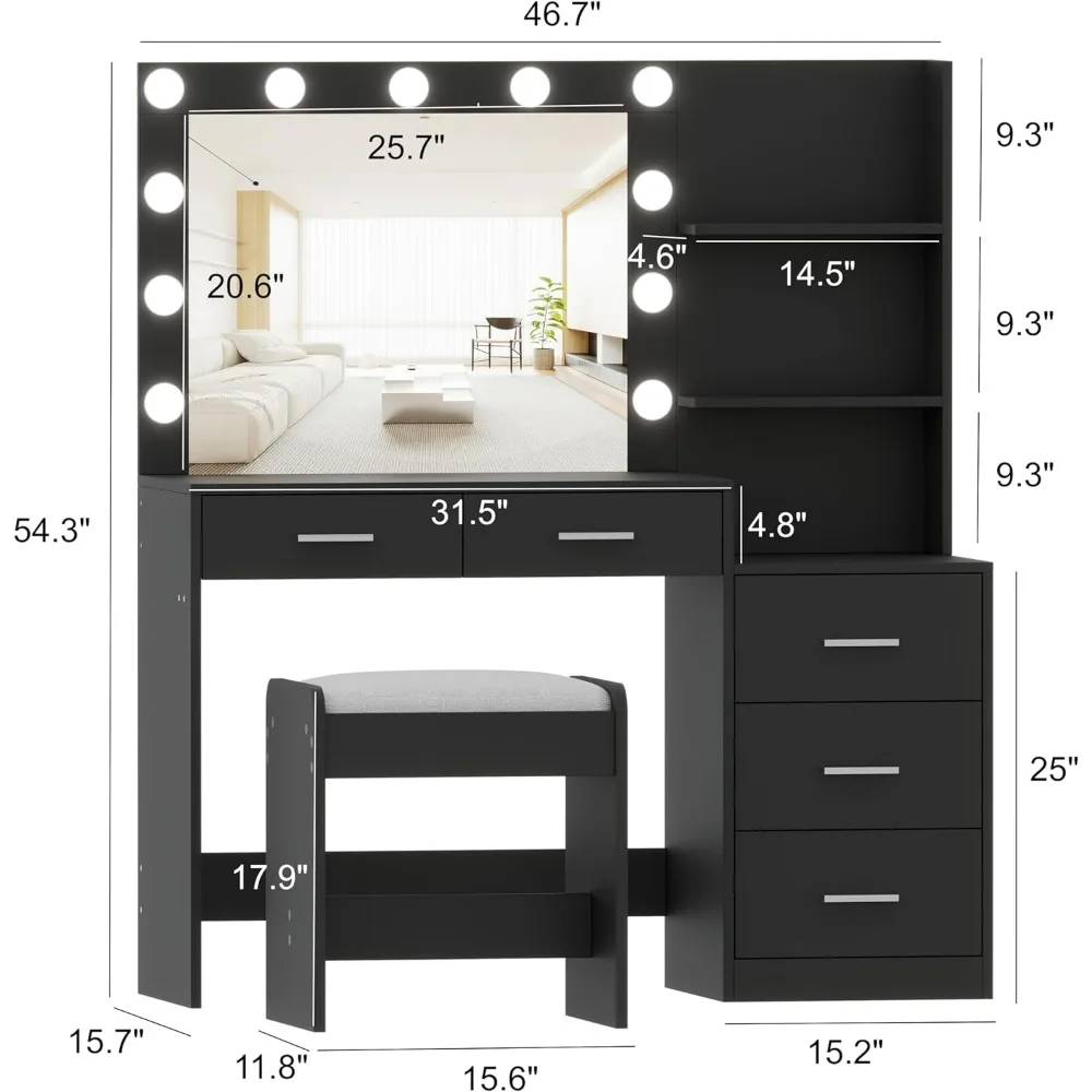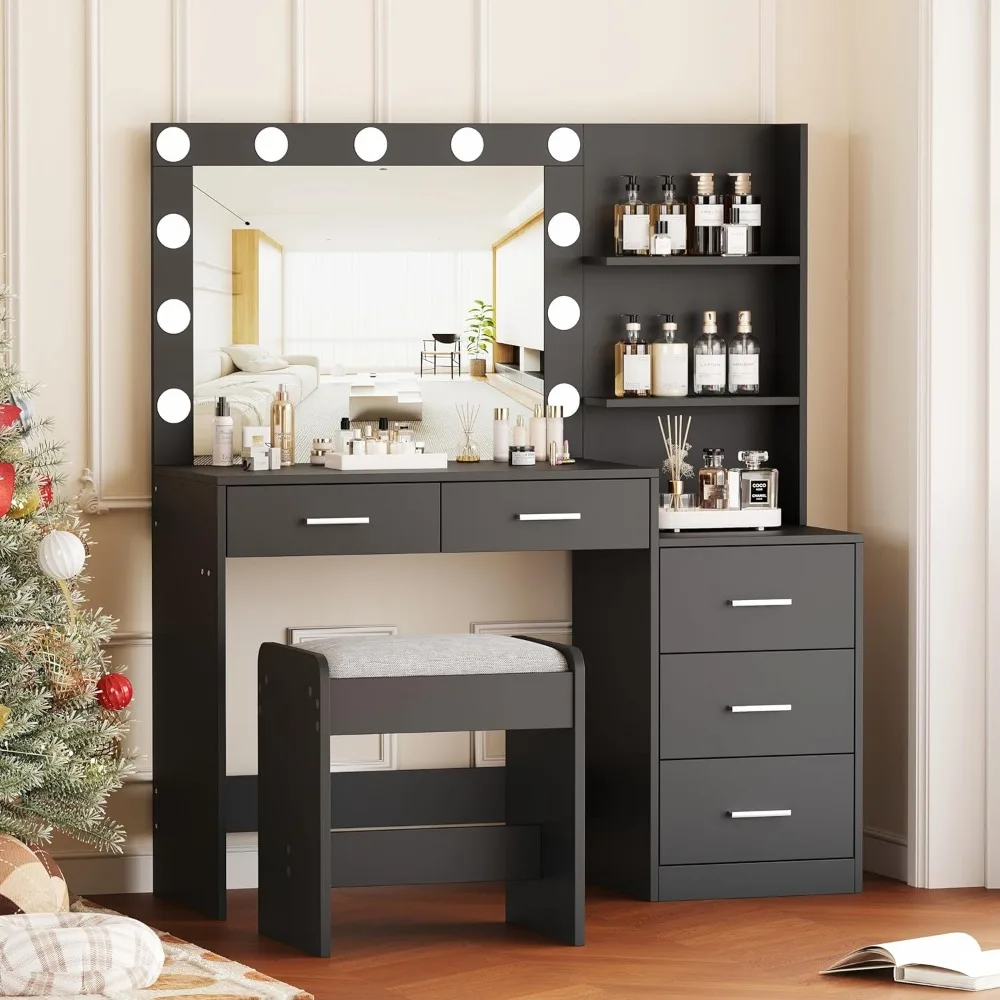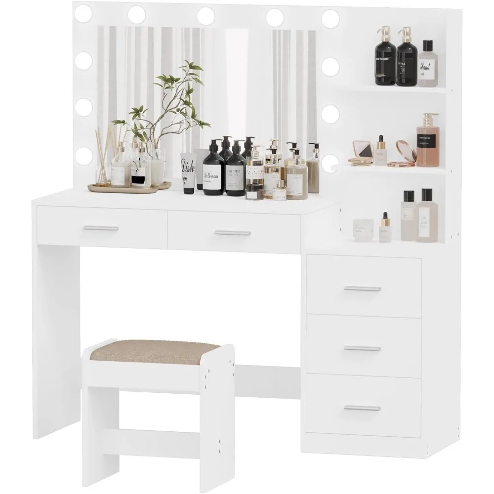 Rovaurx 46.7″W Makeup Vanity Set with Lights and Mirror, Vanity Desk with 5 Drawers, Lighting Colors, Dressing Table for Bedroom