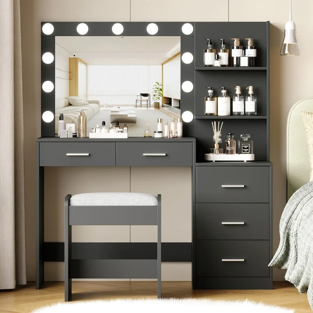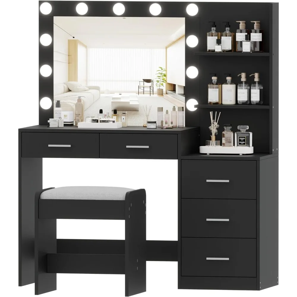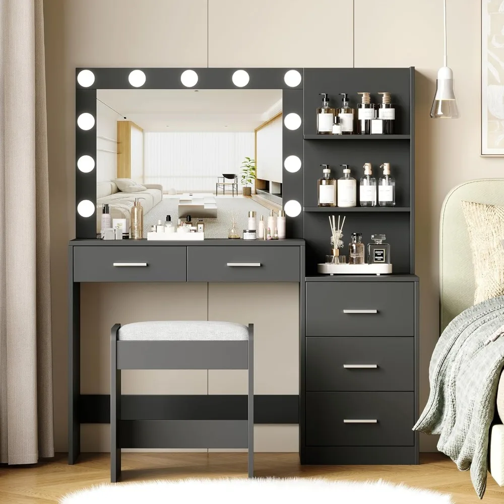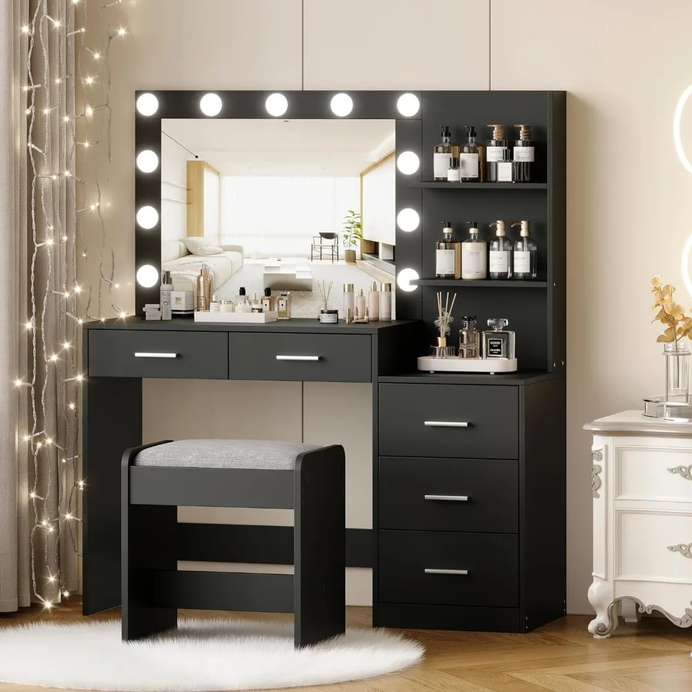 Rovaurx 46.7″W Makeup Vanity Set with Lights and Mirror, Vanity Desk with 5 Drawers, Lighting Colors, Dressing Table for Bedroom